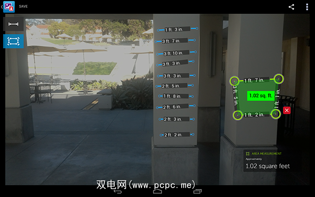 还有一个用于测量距离和计算场所面积的功能。在我的测试中,它不是非常准确。在上方,您可以看到几列的图片(请注意,与阴暗前景相比,明亮的背景看起来有多褪色。)