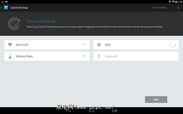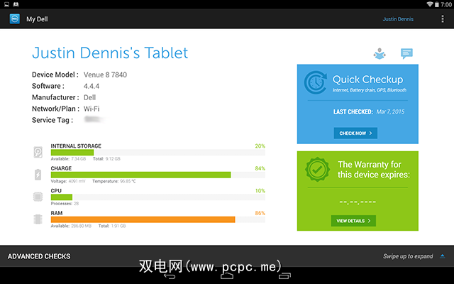 如果您的平板电脑有问题,可以运行快速检查,以验证一切运行顺利。如果有任何问题,您可以与Dell支持人员联系,并且还会显示您的保修信息,以便您知道自己是否受保。
