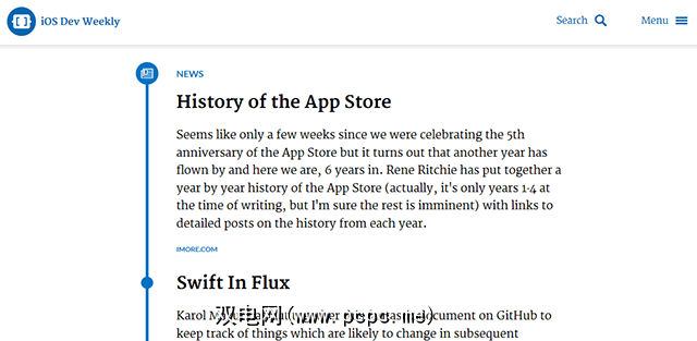 为什么要关注它?因为它是与iOS相关的所有事物的整体集合。在撰写本文时,最新一期包含指向Apple App Store的深入历史,对Swift的易失功能的分析,对Ensembles的关注,免费的在线书,少量的代码教程,甚至还有一些内容的链接。