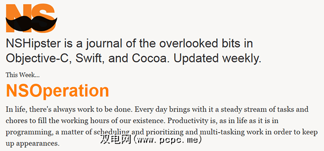 另一个读者推荐的博客 NSHipster 是一个以iOS为中心的博客,它更倾向于程序员技能水平的高级方面。正如标语所解释的那样,NSHipster专注于Objective-C,Swift和Cocoa的“被忽略的方面",并且每周都会发布新帖子。