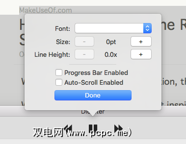 这些控件非常明显:您可以暂停,例如,或跳过用句子或段落转发。底部的蓝色条表示进度,单击复选标记将关闭Dictater。单击眼睛会弹出所谓的提词提示器模式。