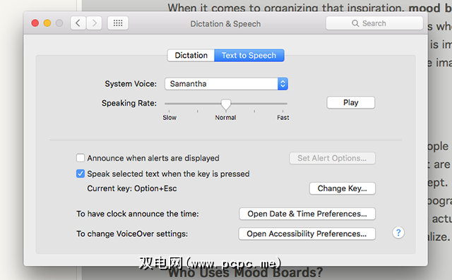 Dictater使用Mac设置使用的任何声音。如果您对此不满意,可以在Mac的设置中找到几种选择。打开系统偏好设置,然后转到听写和语音。单击文本转语音标签,然后可以更改语音: