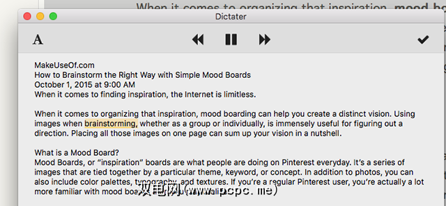 就这样,您的计算机将开始为您阅读文本。但是,与Apple的“开始讲话"选项不同,您会在屏幕的左下角看到此回放的控件。