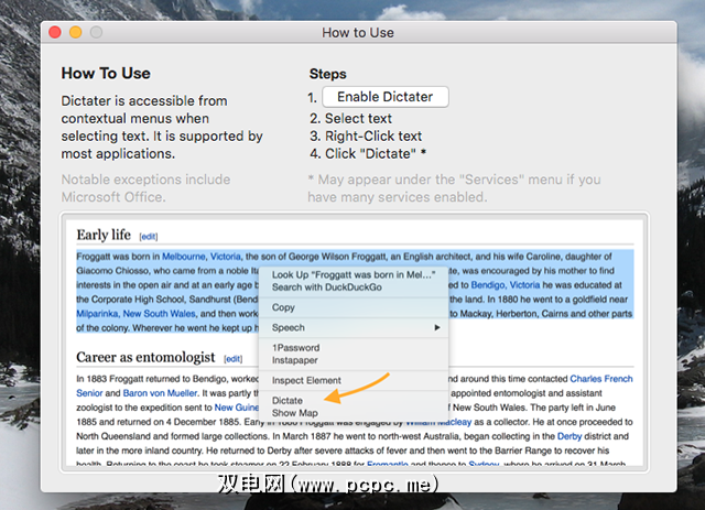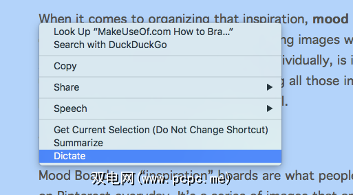 下载应用程序后,启动Dictater很简单:只需突出显示您想听的文本,然后调出上下文菜单即可。从这里只需单击听写: