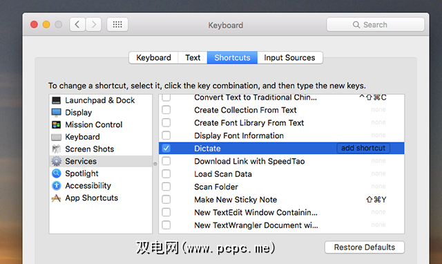 我个人对此有疑问:我找不到 Dictate 选项在El Capitan的“服务"菜单中。重新启动Mac可以解决此问题,因此,如果遇到问题,请尝试一下。