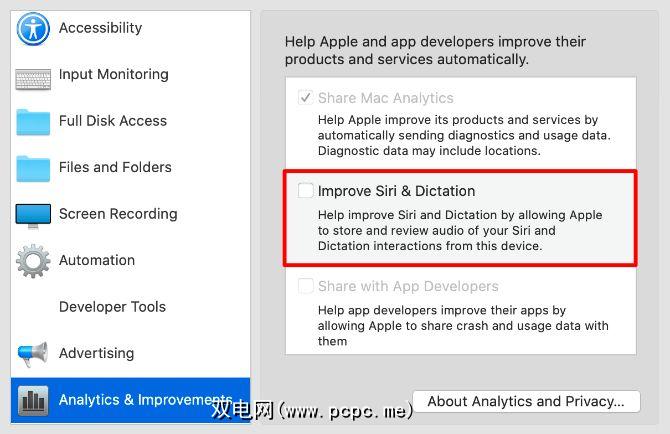 要更改听写使用的数据,请打开系统偏好设置,然后单击安全性。和隐私。转到隐私标签,然后向下滚动以选择侧边栏中的分析与改进。禁用改善Siri和听写功能的选项,以阻止Apple存储或查看您将来的听写记录。