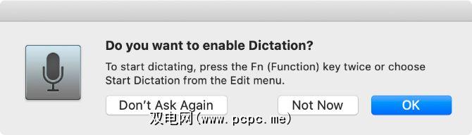 双击 Fn 按钮开始在Mac上听写。您应该看到麦克风图标出现或听到macOS确认音。如果这是您第一次使用听写,请在弹出窗口中单击确定以确认您要使用它。