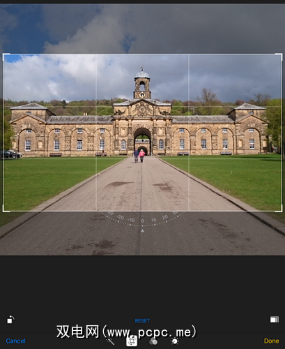 正方形图标会在照片上添加一个矩形轮廓,并在下面带有一个小刻度盘。点击底部的自动以自动拉直照片。您可以移动拨盘以手动执行此操作。
