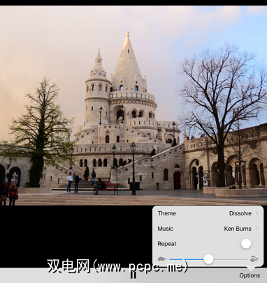 您现在可以修改幻灯片的主题,音乐,并选择重复播放。底部的滑块可让您更改剪辑画面中每张幻灯片的持续时间。在播放幻灯片时,您可以向右或向左滑动以跳至下一张或上一张幻灯片(在其分配的幻灯片显示时间过去之前)。
