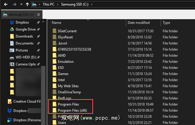 您会发现与众不同的另一个地方是 Program Files 文件夹。在Windows的32位版本上,应用程序将安装到唯一的 Program Files 文件夹中。 64位系统还有一个用于32位软件的 Program Files(x86)文件夹。这是因为为32位体系结构编写软件与为64位系统编写软件有很大不同。