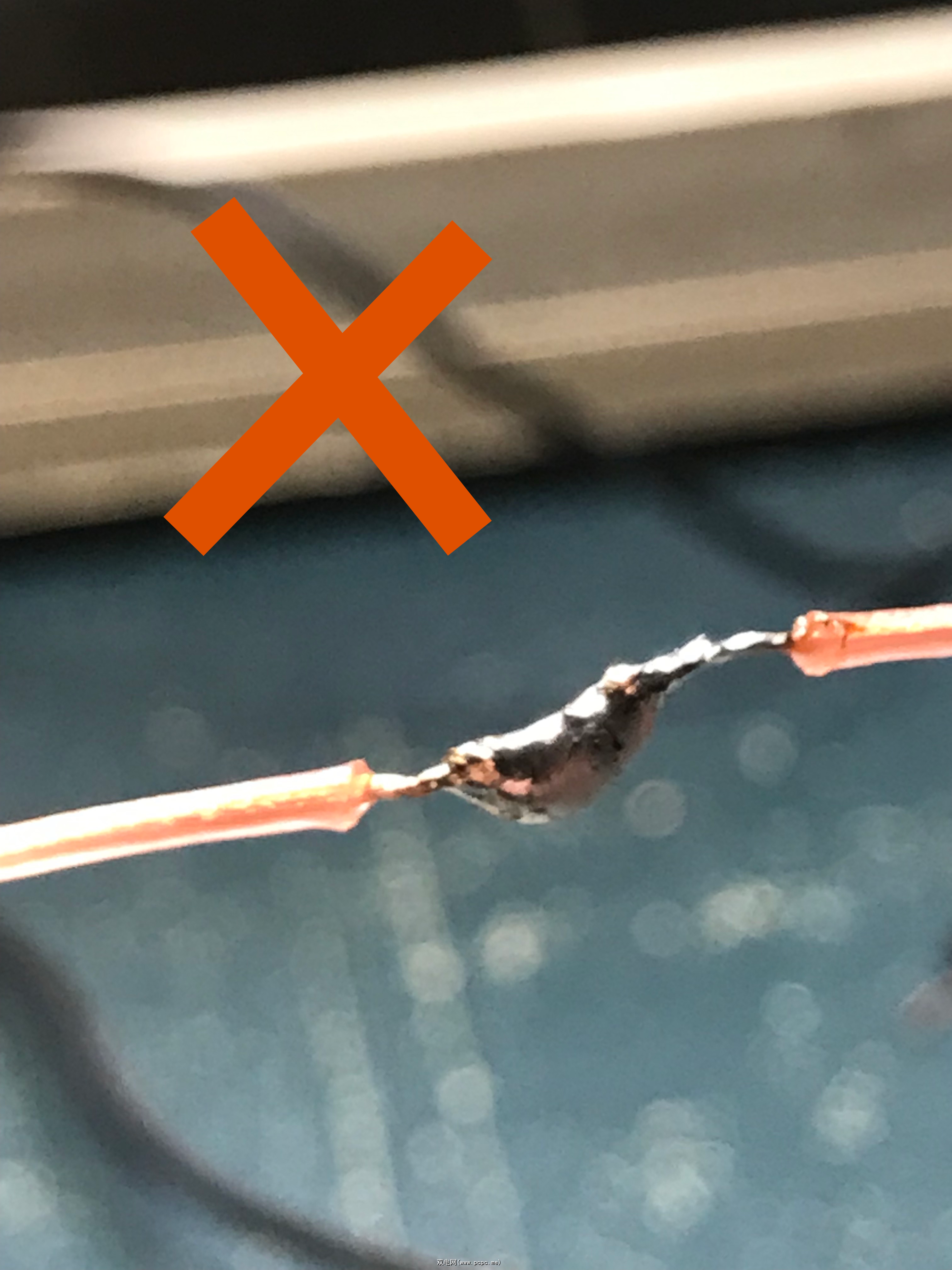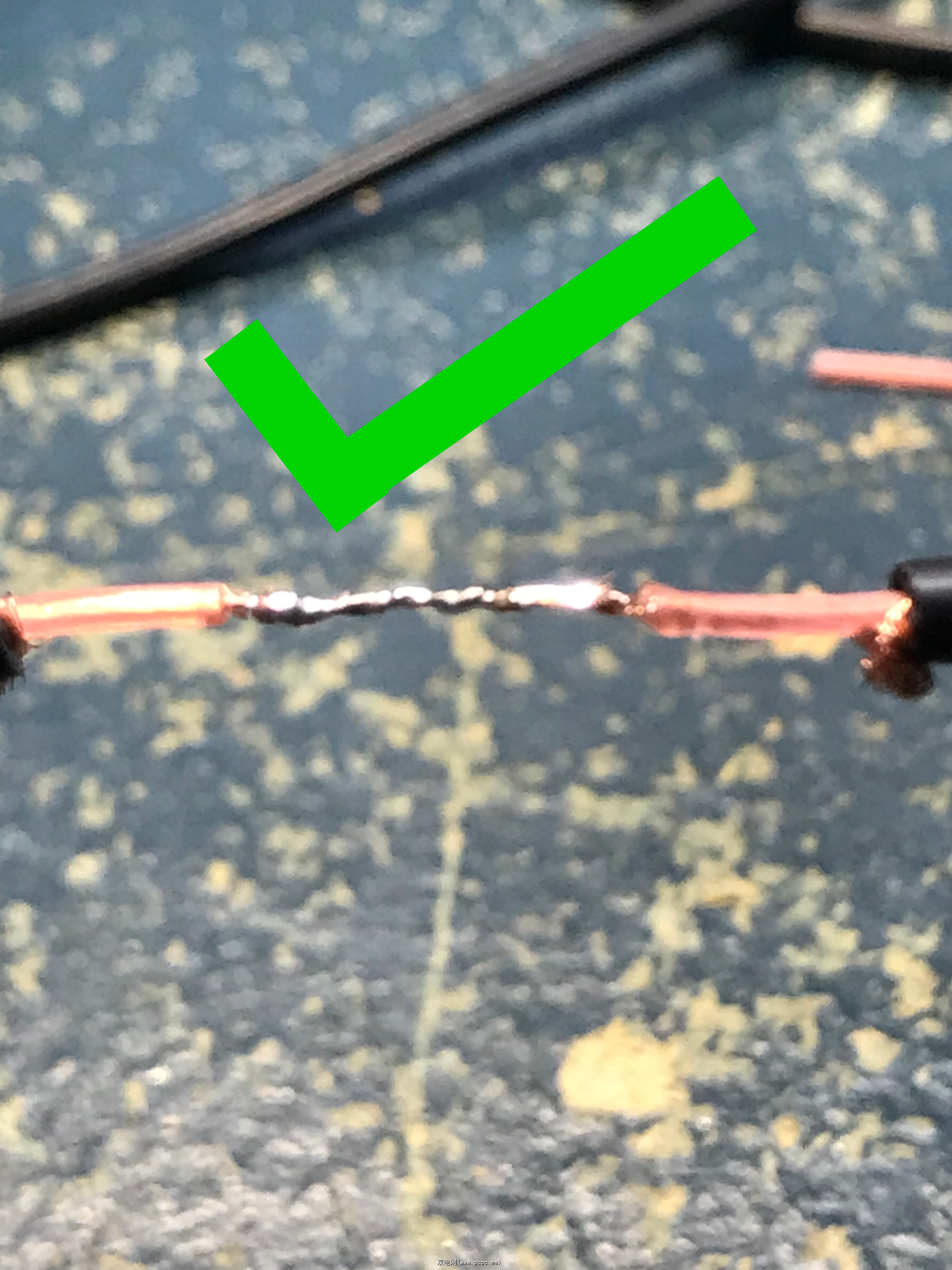 首先,仔细查看焊点——正确的连接将是光亮光滑的,而不是两根电线上的怪诞焊点。我们想要闪亮和光滑,而不是块状和灰色: