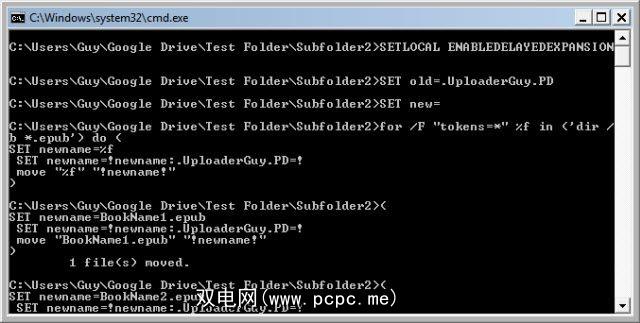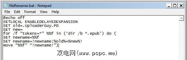 @echo offSETLOCAL ENABLEDELAYEDEXPANSION SET old=.UploaderGuy.PDSET new=for /f "tokens=*" %%f in ('dir /b *.epub') do (SET newname=%%fSET newname=!newname:%old%=%new%!move "%%f" "!newname!")这里有很多事情要做。根据我们到目前为止所学到的知识,其中一些是有意义的。这是个好主意,可以让您自己动手扩展我们所介绍的内容,并开始进一步学习如何精心制作批处理文件。我们称它为独立学习时间。