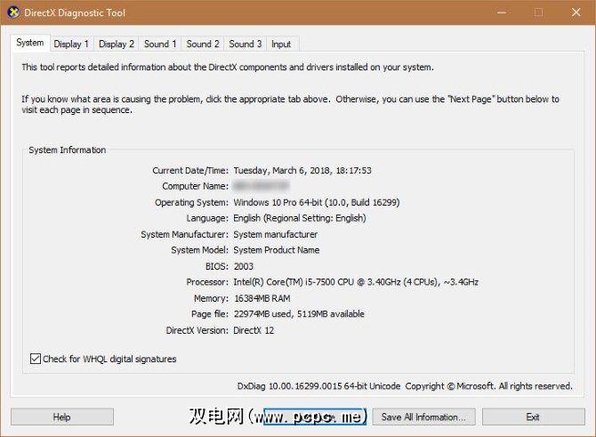 您可以轻松地打开一个面板来查看有关该版本的所有信息。您已经在PC上安装了DirectX。为此,请按 Windows键+ R 打开运行对话框,然后键入 dxdiag 。过一会儿,您会看到一个名为 DirectX诊断工具的窗口: