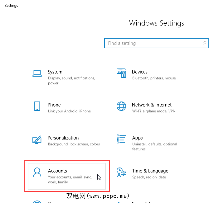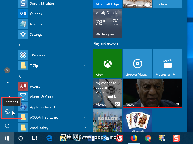 要将标准帐户转换为管理员帐户,请打开“开始"菜单,然后单击设置图标。