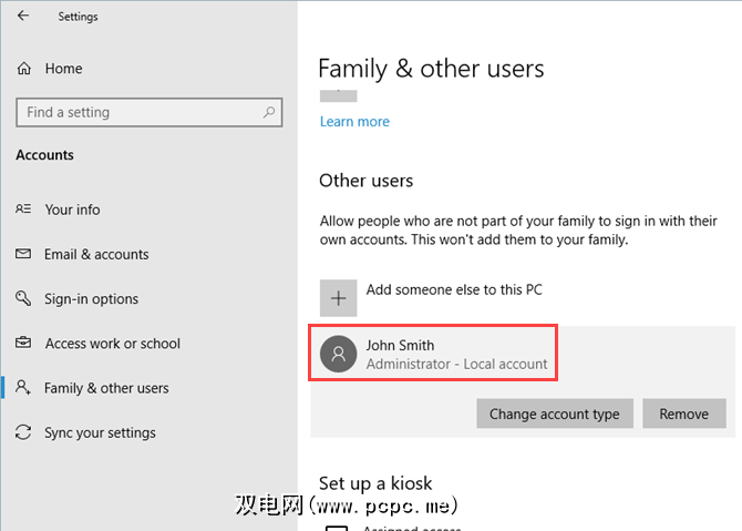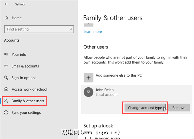 单击家庭和其他用户在左侧窗格中,然后在右侧的其他用户下单击要更改的用户帐户。然后,单击更改帐户类型。