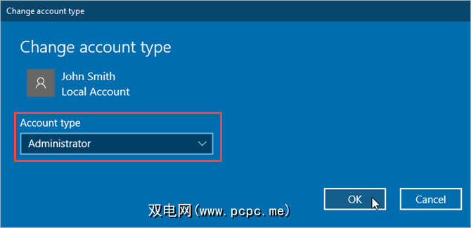 在更改帐户类型对话框上,从中选择管理员。 >帐户类型下拉列表,然后单击确定。