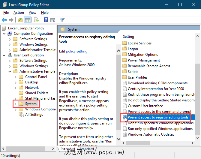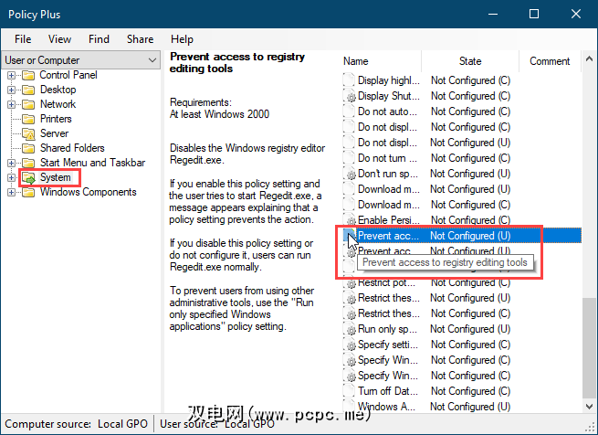 要禁止访问使用Policy Plus的注册表编辑器,在左窗格中选择系统。然后双击左窗格中的防止访问注册表编辑工具设置。