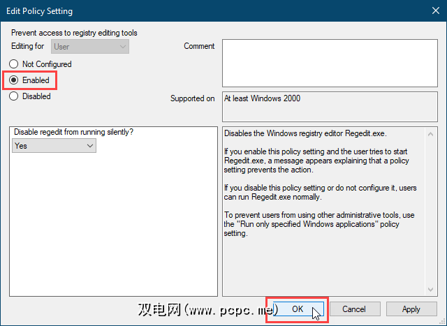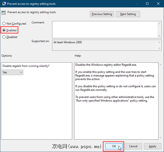 在防止访问注册表编辑工具对话框上,在左上角选择 Enabled ,然后单击确定。