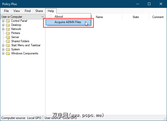 默认情况下,并非所有模板都包含在Policy Plus中。要下载最新的策略文件并将其添加到Policy Plus中,请转到帮助>获取ADMX文件。