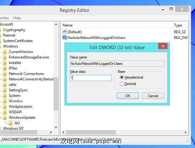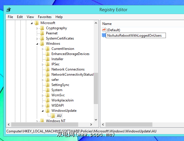 您可能会发现注册表项的最后两个部分(WindowsUpdate \ AU部分)尚不存在。您需要自己创建它们。