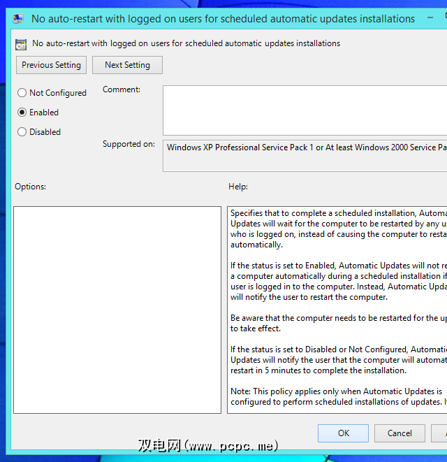 在右窗格中,双击“对于计划的自动更新安装,未使用登录的用户自动重新启动"设置。将设置设置为“已启用",然后单击“确定"。