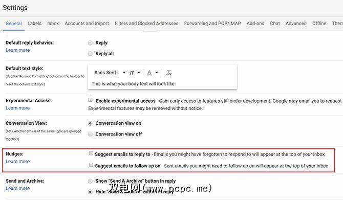 要关闭轻推功能,请转到设置,然后在“常规"选项卡下,向下滚动并确保未选中“轻推"的两个设置。 Gmail默认会启用此功能。