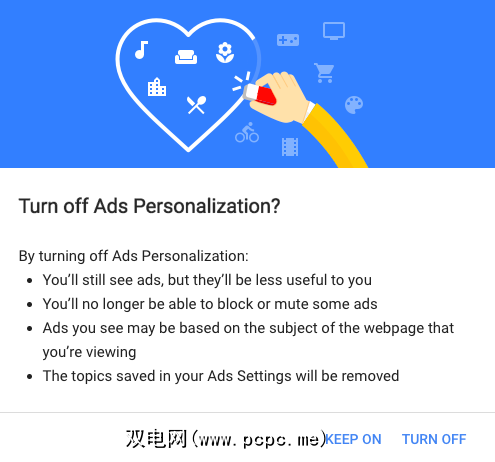 首先,转到Google帐户页面,然后点击广告设置>管理广告设置。在广告个性化旁边,您会看到一个已打开的切换开关。将该功能关闭后,您会看到以下弹出窗口,该弹出窗口警告您关闭该功能可能会失去的东西,包括失去增加广告相关性的选项。如果您可以丢失这些功能,请单击关闭。