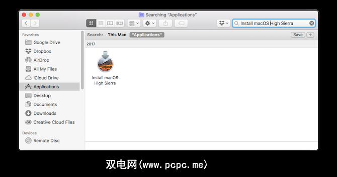 已将操作系统安装文件下载到您的计算机。要找到并删除5.2GB High Sierra安装程序文件,请打开Mac finder并转到 Applications 文件夹。搜索安装macOS High Sierra 并将其删除: