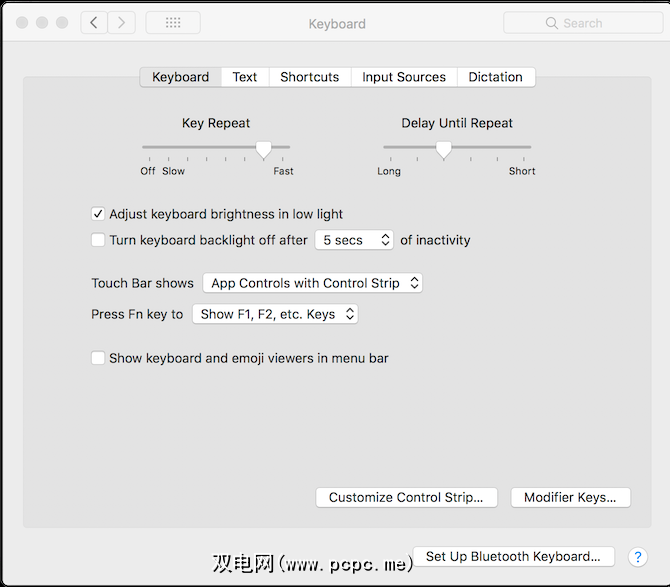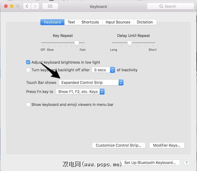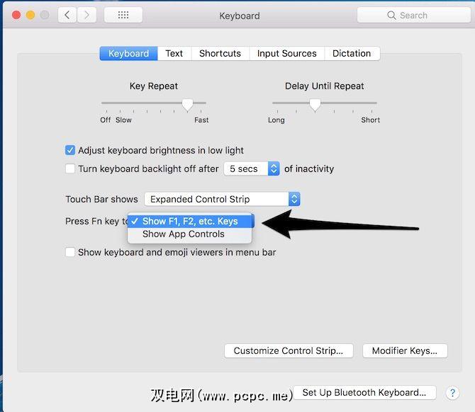 如果您不愿意抛弃这些键而只显示传统的F键,在触摸栏中,返回到系统偏好设置>键盘>键盘。它显示触摸栏,然后选择 F1,F2等。。