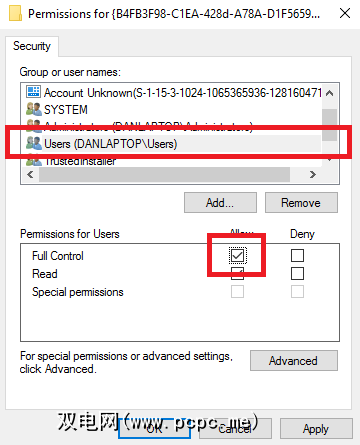 下一步,返回到第一个权限屏幕,突出显示 Users (用户)行,并标记完全控制旁边的复选框。