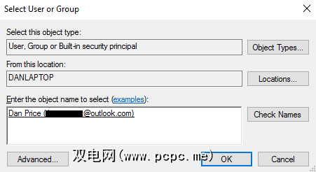 如果Windows不允许您创建新的DWORD值,请在注册表项上右键单击并转到权限>高级>更改,在检查对象旁边的框中输入Windows用户帐户名称,然后单击确定。