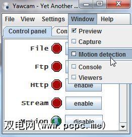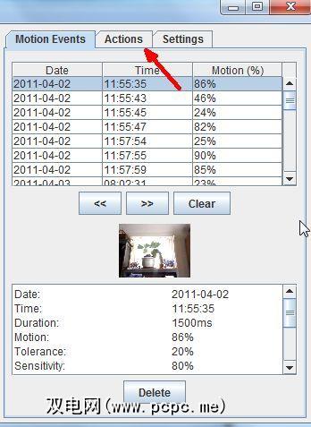 单击“ 窗口",然后从下拉列表中选择运动检测。在下一个屏幕上,您将看到一个页面,每次发生运动事件时(激活检测后),运动检测软件都会在该页面上进行记录。单击“ 动作"选项卡以设置检测到运动时将运行YawCam的文件。