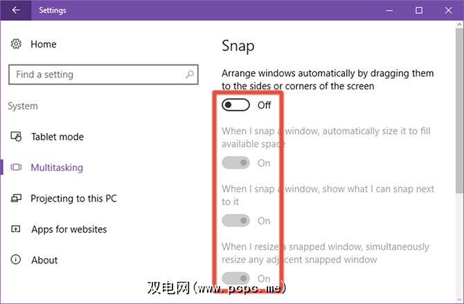 打开开始菜单并启动设置应用。导航到 System> Multitasking (系统>多任务处理)并禁用第一个名为通过将窗口拖动到屏幕的侧面或角落自动排列窗口的选项。禁用该选项也将禁用接下来的三个选项。