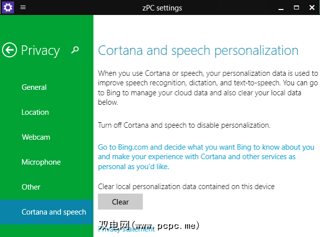 ,当您在Build 9879中转到 zPC设置并在隐私下进行检查时,您会找到一个名为 Cortana并搜索。目前,这里没有什么可做的。在撰写本文时,Bing.com的个性化链接似乎已失效。
