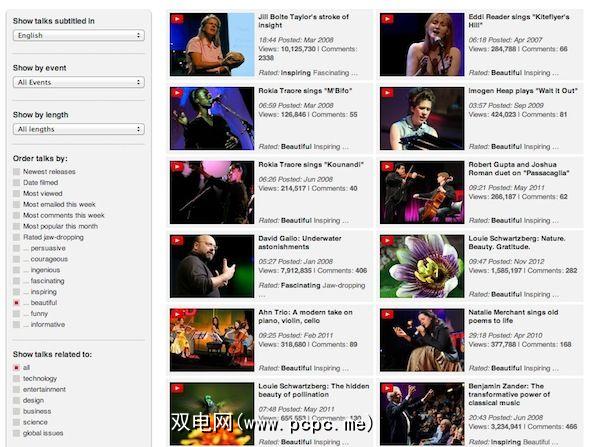 TED网站确实使查找精彩视频变得非常容易。看。您可以按演讲或演讲者进行浏览,并按以下主题过滤结果:技术,娱乐,设计,业务,科学或全球性问题。您还可以进一步缩小视频分级的结果范围:说服力,勇气,机敏,迷人,鼓舞人心,美丽,有趣或信息丰富。您还可以按事件或长度浏览视频。