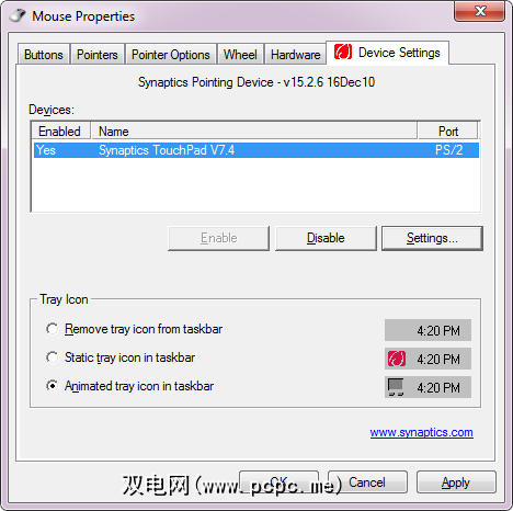 下面是Synaptics触摸板的通用设备设置标签的屏幕截图。