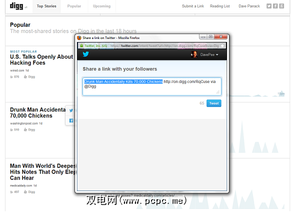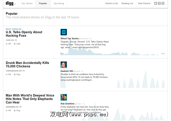 热门部分介绍了前18小时在Digg上引起轰动的故事。这些是按照故事获得的Diggs,Facebook喜欢和推文的顺序显示的。每个页面都有一个可视化图表,显示该时期的受欢迎程度如何达到顶峰和谷底。