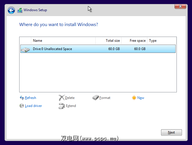 购买全新的硬盘驱动器时,计算机只会将其视为未分配的空间。假设您要在新驱动器上安装Windows。在此过程中,您将看到类似以下的屏幕: