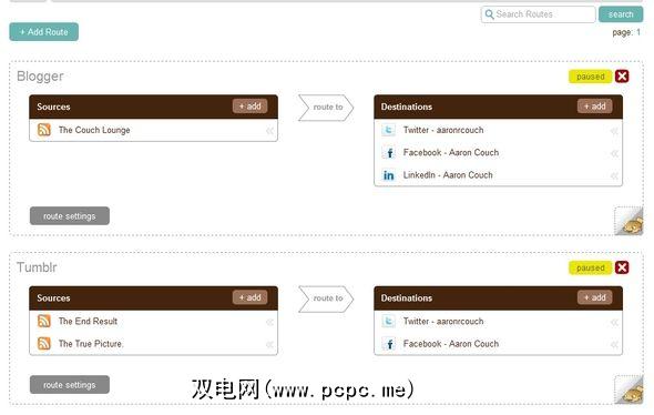 我认为Dlvr真正令人眼前一亮的地方是它具有多条路线并能够每条路线接收多个RSS提要。基本上,路线由两部分组成:来源(即RSS提要)和目的地(即社交网络)。通过参考下面的图片,可能会更容易理解。