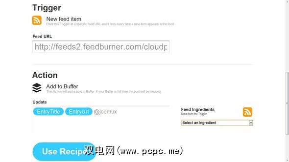 在开始设置简历之前,您必须签名向上缓冲区。完成后,返回IFTTT(您也需要一个帐户)并设置配方。您必须将IFTTT连接到Buffer,然后按照将RSS feed添加到触发器并对“更新"框进行任何更改的步骤进行操作。您可以根据需要自定义此方法。在该框的右侧,您将看到一个“成分"的下拉菜单。您可以随意使用这些成分,直到您做出自己喜欢的混合物,然后单击蓝色的大按钮,上面写着“使用配方"。许多您想要的博客。