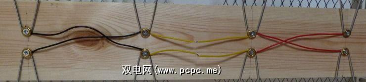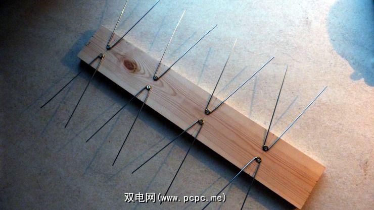 下一步,将V型部分与导线连接在一起。顶部和底部应纵横交错,并沿中间笔直延伸。请使用以下照片作为指南。请注意,我是如何从两条中间线剥去一部分绝缘层的。