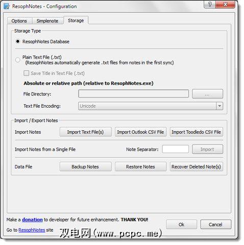 从存储中的选项对话框中em>选项卡,您可以将程序设置为将笔记备份到本地数据库。另外,您也可以将它们作为纯文本文件同步到文件夹。