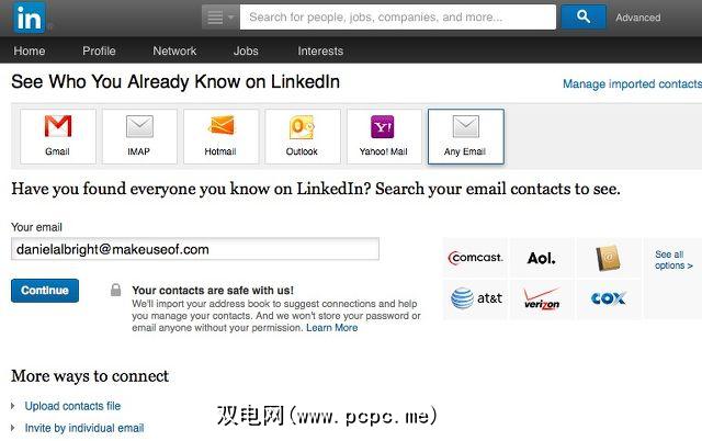 寻找连接时要做的第一件事是使LinkedIn对您的电子邮件帐户具有访问权限,以查看您的联系人中已有多少个帐户。只需转到网络->添加连接。如果添加您的个人和专业电子邮件帐户,您可能会发现认识很多已经在LinkedIn上的人。您可以自动邀请所有这些人进行联系。