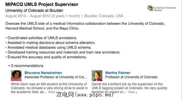 参考来自两种不同的方式:首先,您可以让某人为您编写公开显示的参考。这就像常规的工作参考。其次,他们可以认可您的技能。如果您在个人资料中列出了一项技能,则任何人脉关系都可以为您提供支持。受到某项特定技能的高度认可,这表明潜在的雇主表明其他人赞赏您的能力,并且您拥有宝贵的技能。如果您找到一份新工作,开始做一些新的志愿服务,或者在网上发布了新项目,请确保将它们包括在您的个人资料中。拥有专业外观的个人资料,大量有用的信息和大量的联系之后,第一时间的回报会有所增加。从基础开始,然后从那里开始构建!