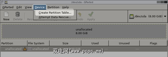 最终,您将看到GParted的主菜单。在主菜单中,右键单击设备,然后从上下文菜单中选择创建分区表。
