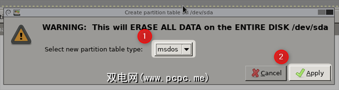 将出现一个弹出菜单。将选择新的分区表类型从 msdos 更改为GPT。由于某些原因,在某些型号的计算机上,我无法使安装程序在旧计算机MS-DOS上使用标准表类型。