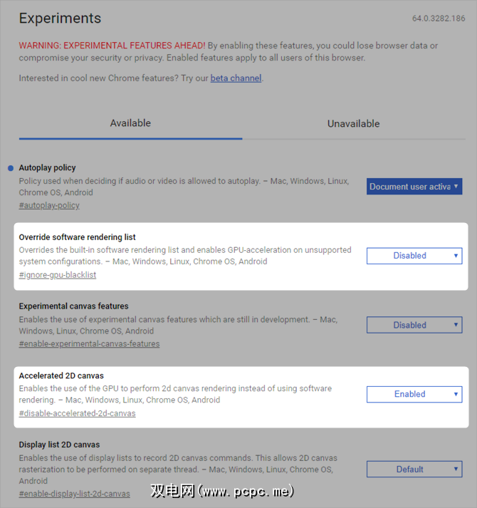 您可能需要修改的第一个(也是唯一)功能是覆盖软件渲染列表。默认情况下,某些图形处理器无法在Chrome中运行。通过强制Chrome使用不受支持的GPU,您可能会看到性能上的巨大提升。如果已禁用,则值得尝试。 (加速2D画布是您可能要打开的另一个功能。)