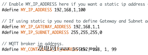 您需要为控制器定义一个静态IP地址,网络路由器和子网的IP以及您的IP地址。现有的MQTT服务器。如果愿意,也可以随意修改主题前缀。上传,然后将其插入网络。简要检查串行控制台是否有任何明显的错误,例如无法连接到MQTT服务器,否则将其放在一边(但将其保留)。