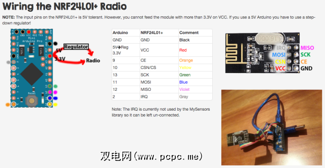 我强烈建议您首先进行一些基本测试,只是为了确定您的收音机是工作。如MySensors页面上所示,连接两个无线电。它们的图显示Arduino Micro板无关紧要-使用相同的引脚号。请注意,该图从顶部示出了NRF24L01;您实际上是从下面插入的东西。进行相应的调整。忽略灰色的IRQ引脚,当前未使用。总结: