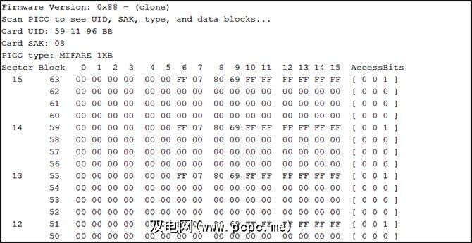 要测试设置,请打开 DumpInfo 从文件>示例> MFRC522> DumpInfo 中绘制草图,然后将其上传到Arduino开发板。打开串行监视器,然后将其中一个RFID对象放在读取器上。您应该看到类似这样的内容:
